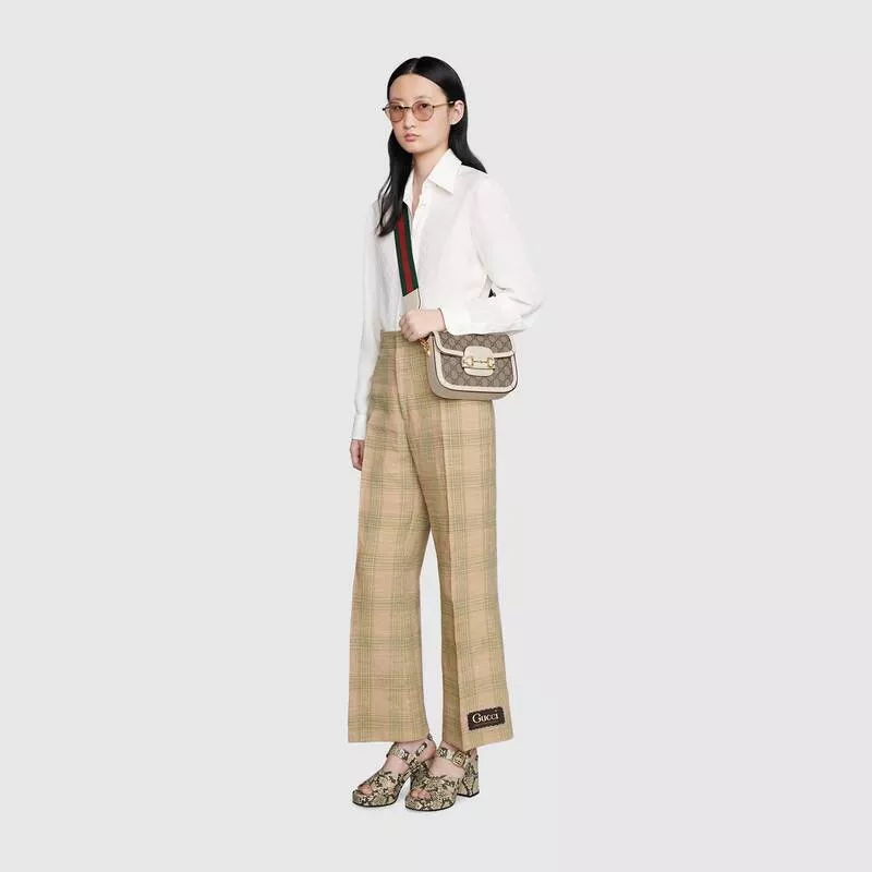 The Gucci Horsebit 1955 Mini Handbag adds a mix-and-match style to this retro-style collection. This mini handbag is equipped with two different shoulder straps. A leather shoulder strap in the same tone can create a discreet and elegant atmosphere. The red and green webbing shoulder straps highlight a strong brand identity. The handbag is made of canvas with a pattern of double G letters interwoven and decorated with white leather trim.